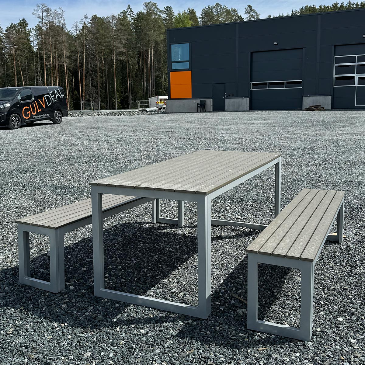 En vedlikeholdsfri benk laget av aluminium og PVC er et ideelt valg for utendørs bruk på grunn av dens holdbarhet og lave vedlikeholdskrav. Benk i aluminium i lyse grå farge, mens bordplate og sitteflater har vedlikeholdsfri grå lasert treuttrykk. Her er en beskrivelse av dens fordeler og bruksområder: