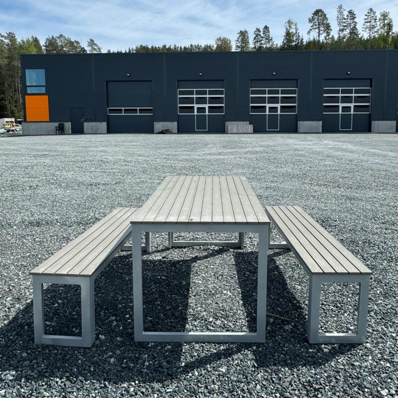 - Moderne design: Kombinasjonen av aluminium og PVC gir benken et moderne og stilrent utseende, som passer godt i mange ulike utendørs miljøer, fra private hager til offentlige parker.